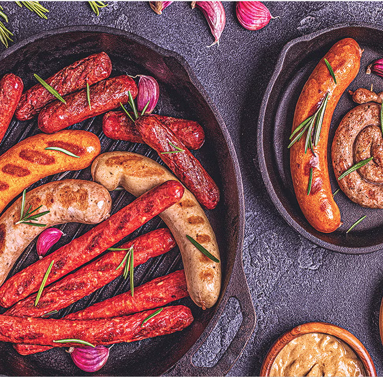 Notre gamme comprend plus de 150 variétés de saucisses, inspirées des recettes traditionnelles de nombreux pays. Du Käsekrainer autrichien aux merguez nord-africaines, chaque saucisse raconte une histoire. Certaines sont proposées en plusieurs versions, comme le Käsekrainer décliné en poulet, porc ou zébu.